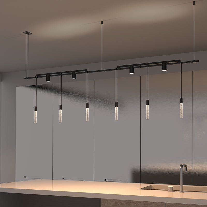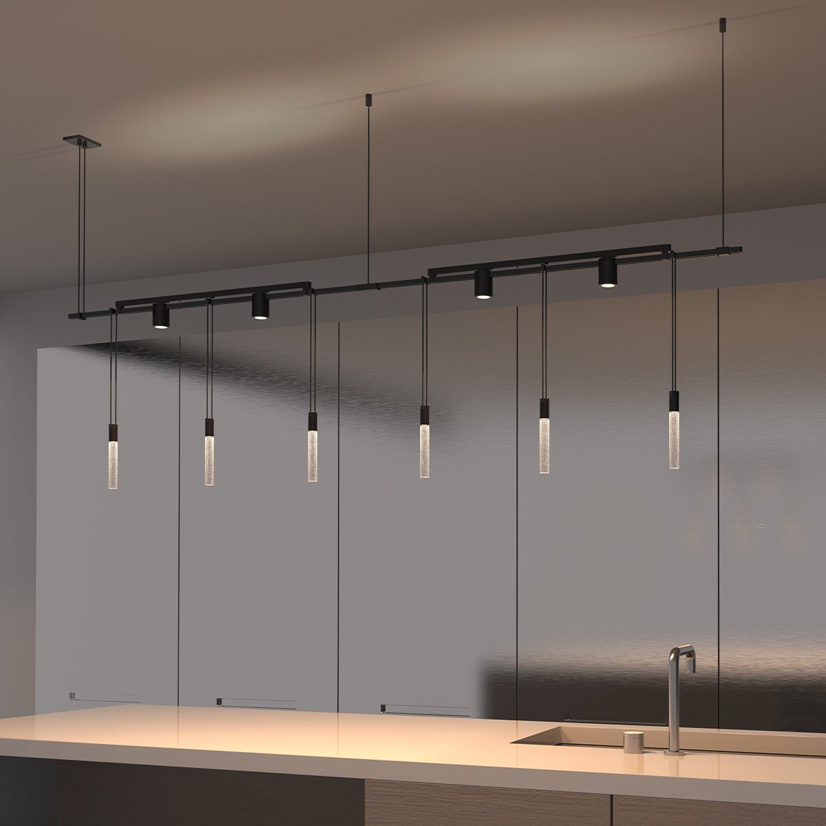 Power bars are suspended at right angles to each other, connected by perpendicular Power Bar Hangers. Zig Zag arrangements can be used to form a linear pattern, or combined and oriented to form a broad composition arrayed across the plane of an entire ceiling.