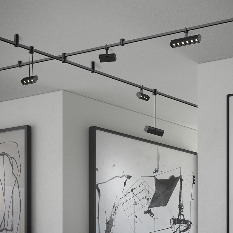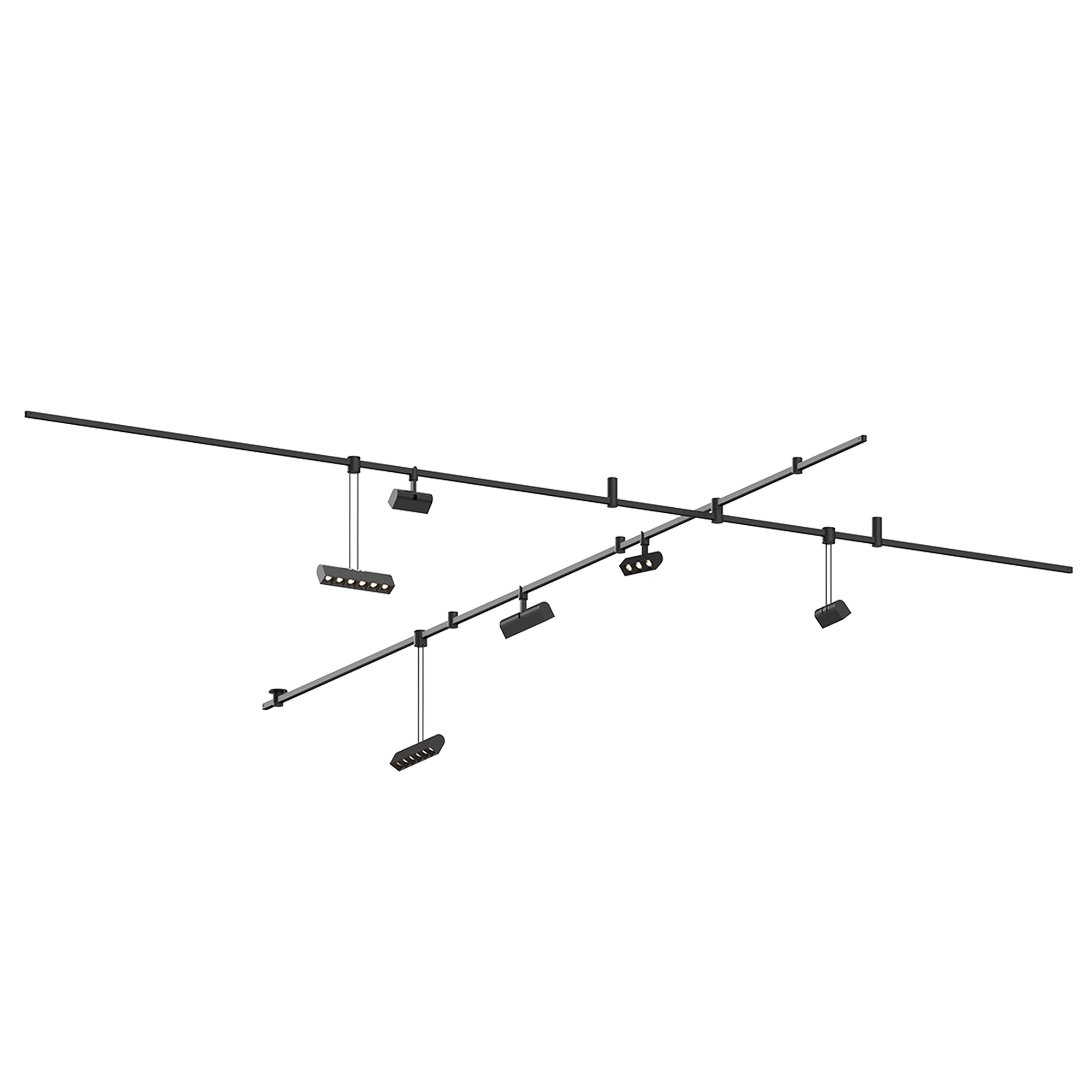 Power bars are suspended at right angles to each other, connected by perpendicular Power Bar Hangers. Zig Zag arrangements can be used to form a linear pattern, or combined and oriented to form a broad composition arrayed across the plane of an entire ceiling.