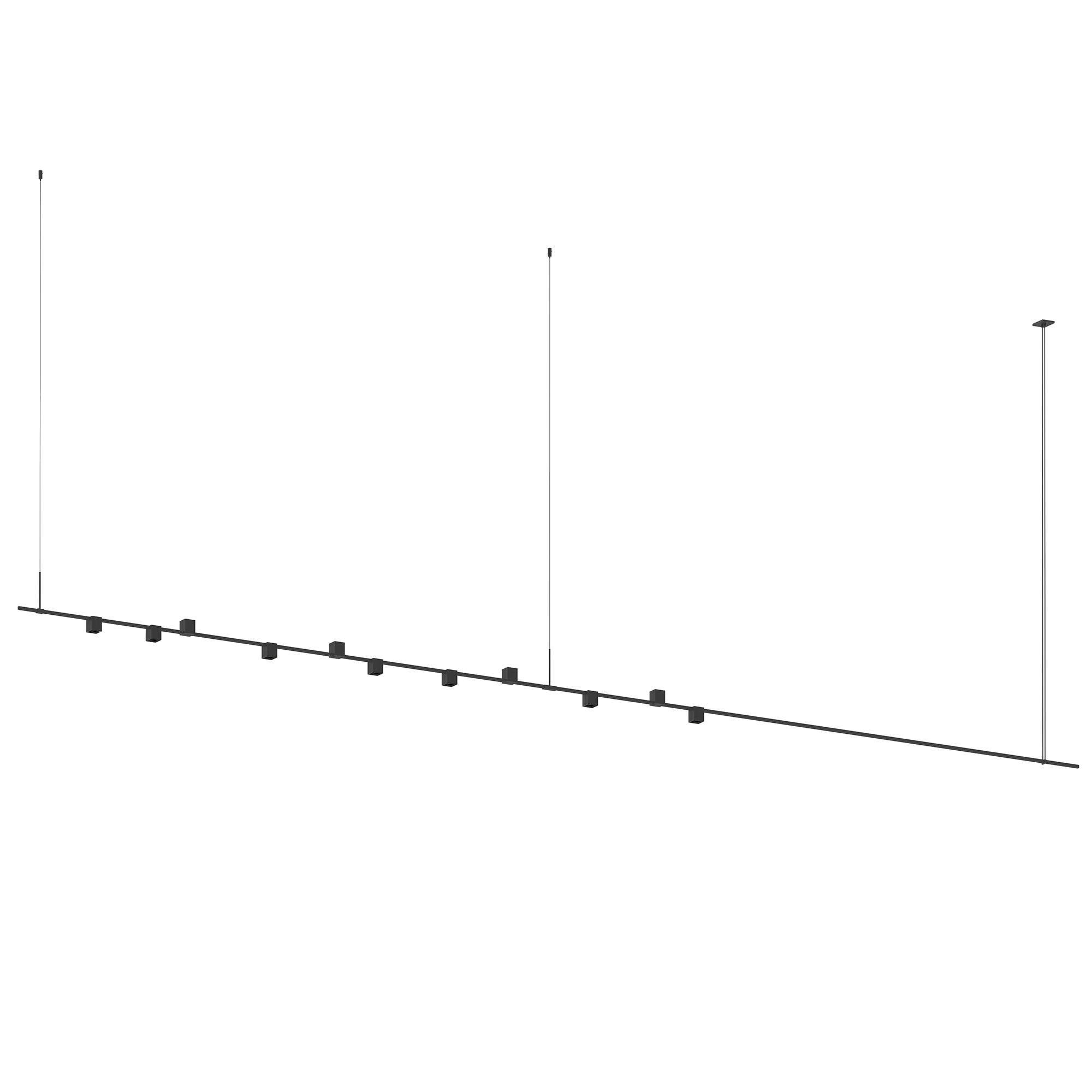Power bars are suspended at right angles to each other, connected by perpendicular Power Bar Hangers. Zig Zag arrangements can be used to form a linear pattern, or combined and oriented to form a broad composition arrayed across the plane of an entire ceiling.