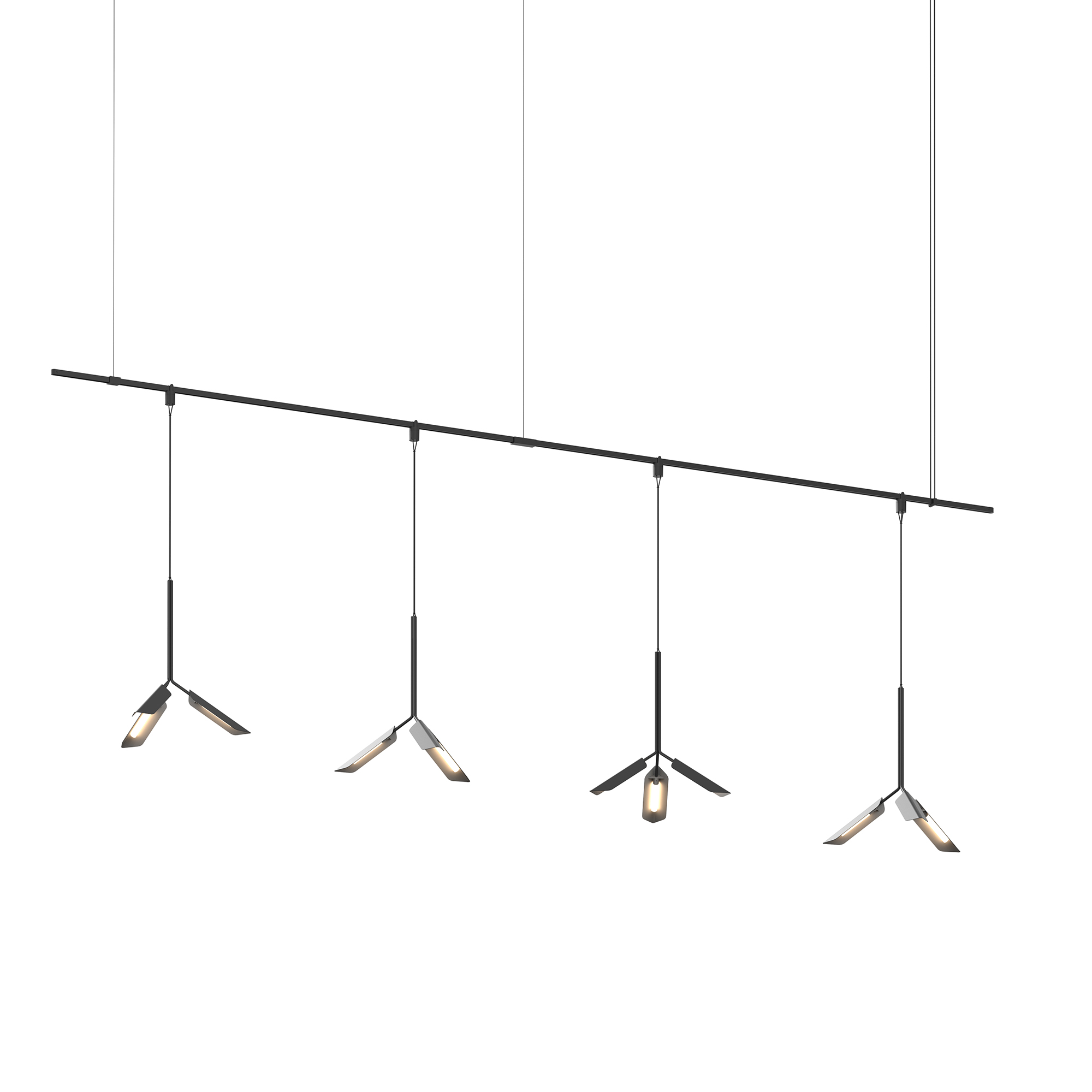 Power bars are suspended at right angles to each other, connected by perpendicular Power Bar Hangers. Zig Zag arrangements can be used to form a linear pattern, or combined and oriented to form a broad composition arrayed across the plane of an entire ceiling.