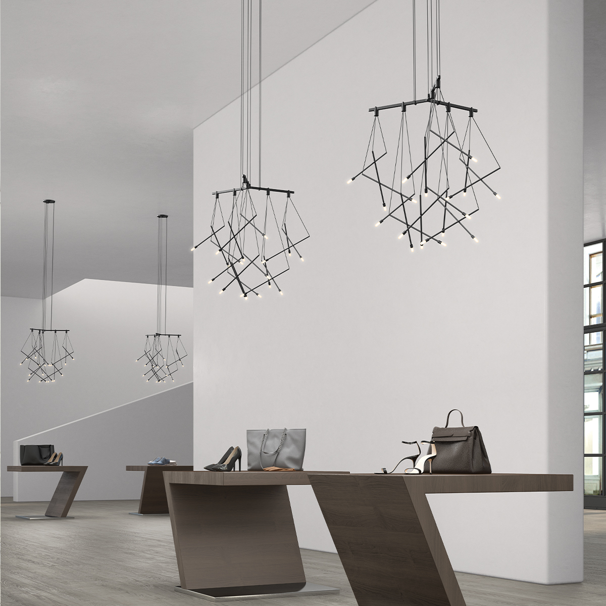 Power bars are suspended at right angles to each other, connected by perpendicular Power Bar Hangers. Zig Zag arrangements can be used to form a linear pattern, or combined and oriented to form a broad composition arrayed across the plane of an entire ceiling.