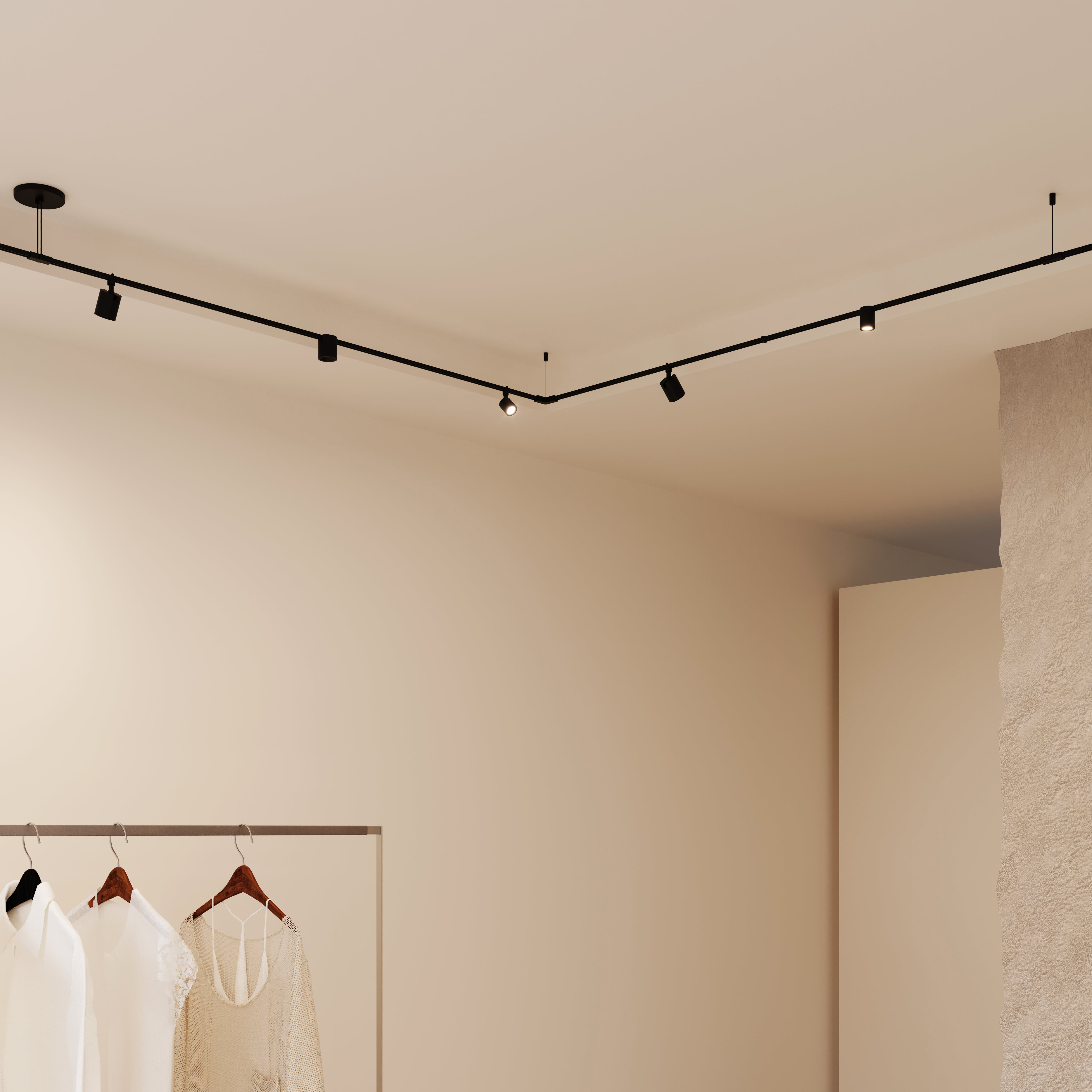 Power bars are suspended at right angles to each other, connected by perpendicular Power Bar Hangers. Zig Zag arrangements can be used to form a linear pattern, or combined and oriented to form a broad composition arrayed across the plane of an entire ceiling.