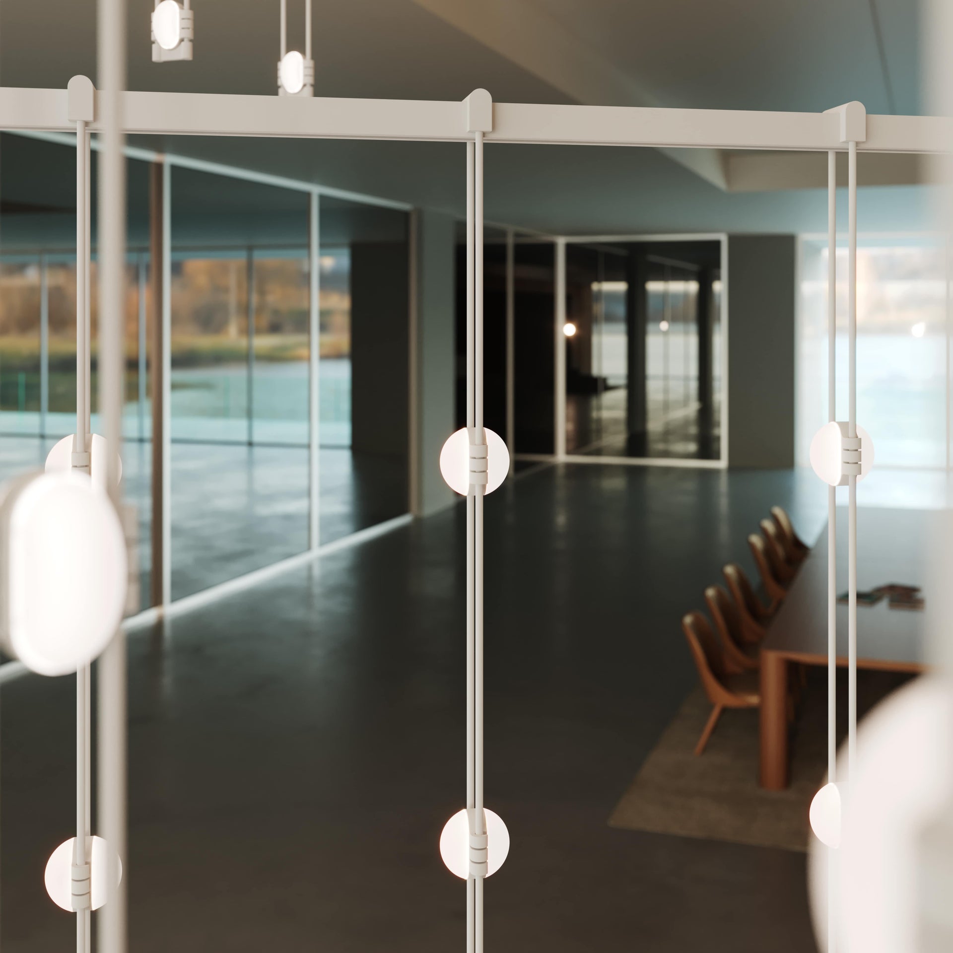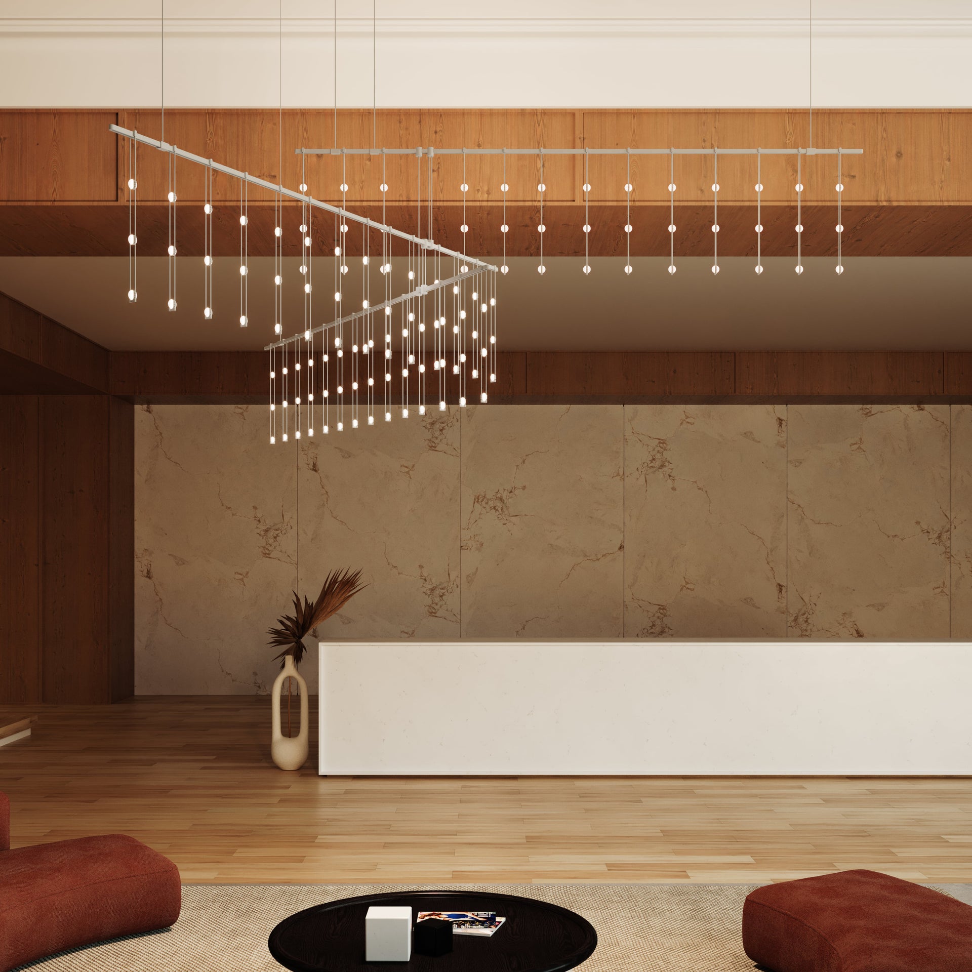 Power bars are suspended at right angles to each other, connected by perpendicular Power Bar Hangers. Zig Zag arrangements can be used to form a linear pattern, or combined and oriented to form a broad composition arrayed across the plane of an entire ceiling.