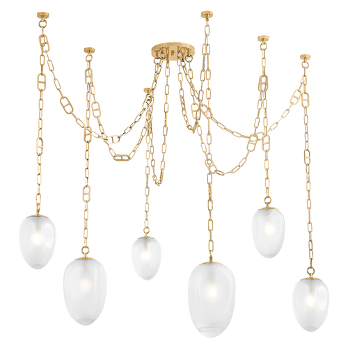 Taking inspiration from the ‘sugarloaf’ gemstone cut, the elongated shades of Daith feature a softened pyramid structure. Made from super thick, clear, etched glass, they are suspended on Noz’s signature mariner chain, which is finished in Vintage Brass. Available as either a 3 or 6-light chandelier or a single-light sconce. Part of our Noz Nozawa collection.