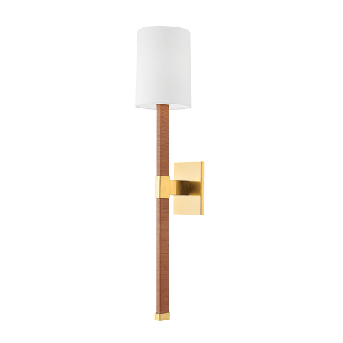 Minnetonka balances rectangular profiles in its armature with the softer natural qualities of linen and rattan wrap for an artful yet understandable silhouette. The Aged Brass backplate and accents create a refined counterpoint to the rustic textures. This distinctive blend of materials, coupled with Minnetonka’s elongated torch shape, hints at a nautical influence.
