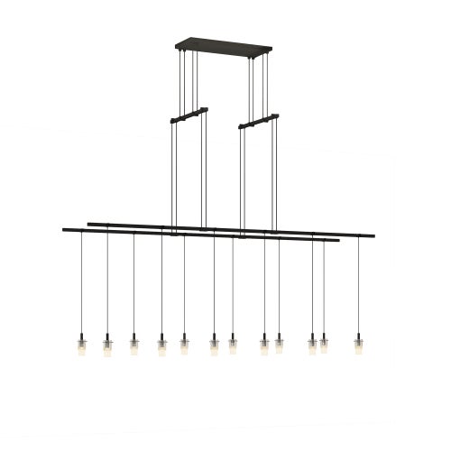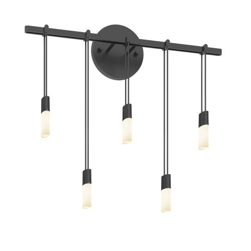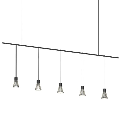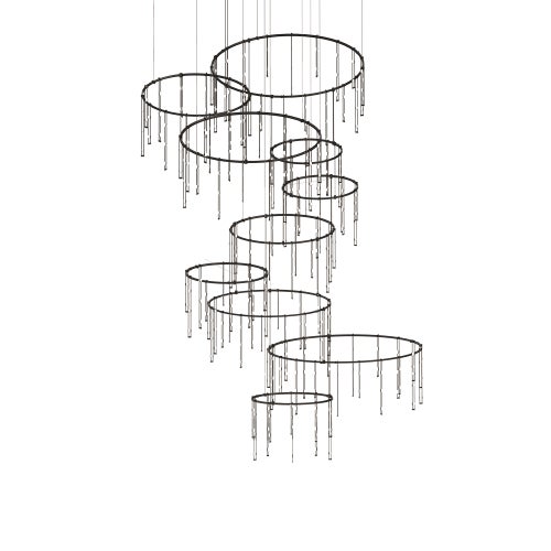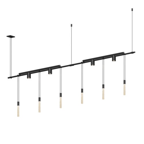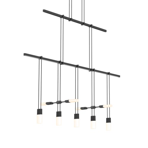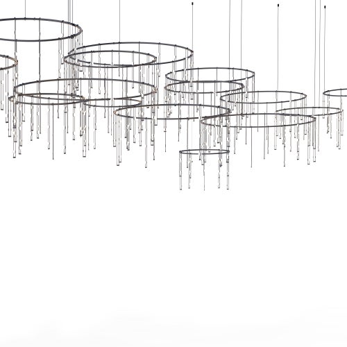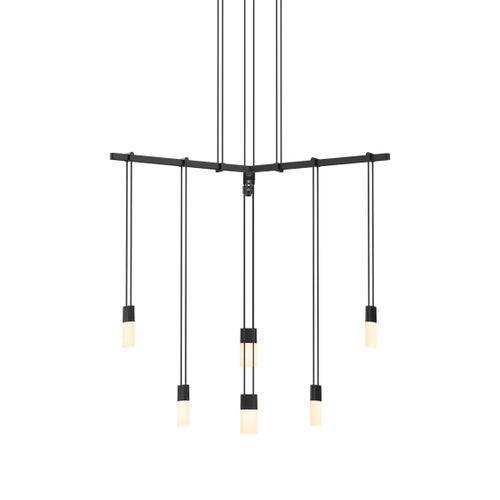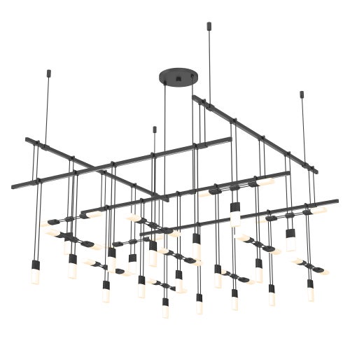 Power bars are suspended at right angles to each other, connected by perpendicular Power Bar Hangers. Zig Zag arrangements can be used to form a linear pattern, or combined and oriented to form a broad composition arrayed across the plane of an entire ceiling.