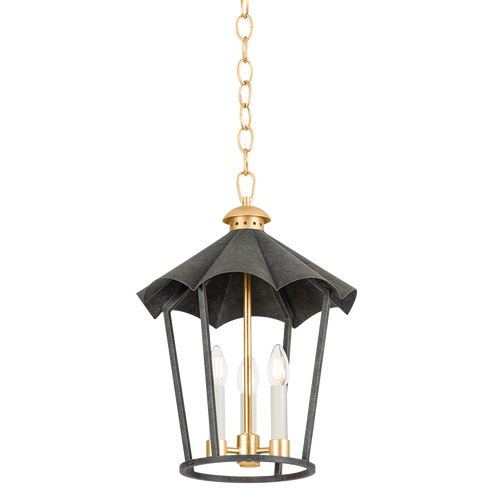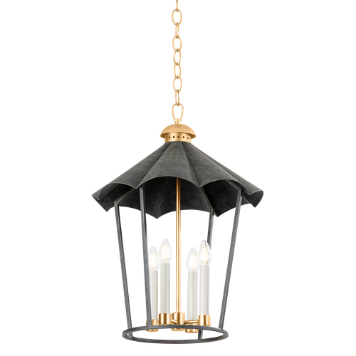 Finished in French Iron and Vintage Gold Leaf, the slim cage exudes a timeless elegance. The retro ruffled hood receives a modern update with exaggerated peaks and valleys that feel fashion-forward and fun. Available with 3 or 4 lights.