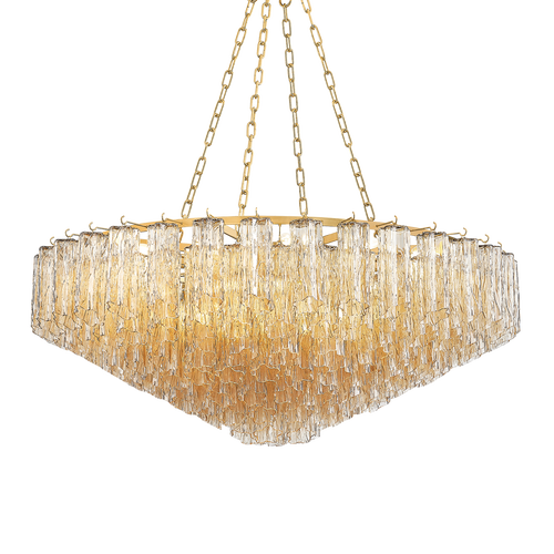 The incredible quantity of layers, lights, and complex glass shapes make Watertown a dramatic showstopper. Inspired by Art Deco aesthetics, this maximalist chandelier features organically shaped Tronchi glass shades with textured cuts. The shades are arranged to form a descending point at the center, reminiscent of water droplets. Watertown is available with 9, 21, or 45 lights.