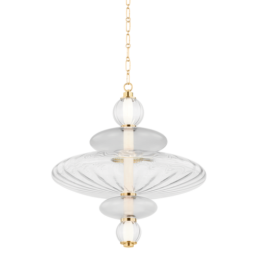 Old meets new in the nostalgic Williams pendant. Streamlined renditions of classic glass techniques are stacked to create a striking totemic composition. Alternating clear optic and smoked glass shades are stacked around a single LED tube, which serves as the core of this eye-catching fixture. Williams is available in two sizes and is finished in Aged Brass.