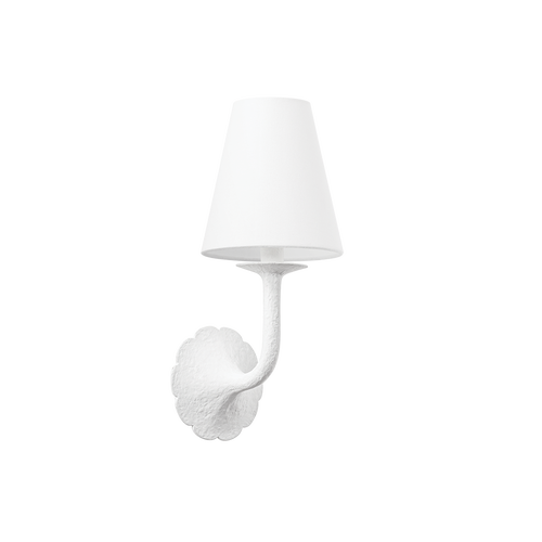 Inspired by a flower in bloom, the charming Winnipeg sconce features delicate scalloped edges and a tailored silhouette. The botanical backplate swoops elegantly upwards to cradle the light source, which glows through a tapered white linen shade. A White Plaster finish imparts a chic, contemporary feel, while the Vintage Gold Leaf is refined and classic.